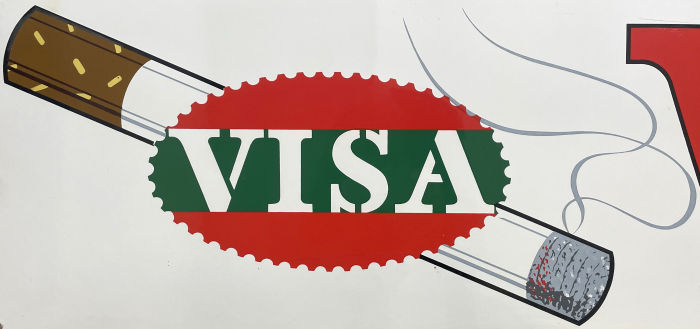 Cigarettes Emailschild, Maße 65 x 56 cm, abgekantet Zustand 2-3 zwei Schäden im Schwarz, schöner Glanz & Farben datiert 1954 Hersteller-Bez.: O. Warland, S.A. 40, Rue de Koninck, Bruxelles Steuer-Bez.: T.P. Bruxelles 359-544-1954 Euro 500,- siehe Detailansicht der beiden Rauchergenerationen |