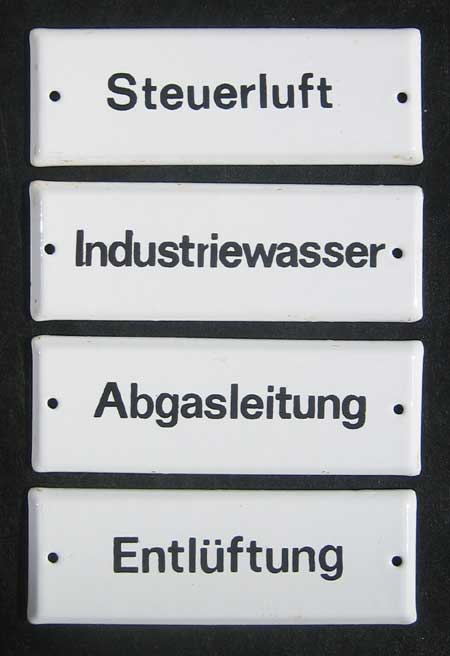 Schilder aus Chemiewerk Emailschilder aus der chemischen Fabrik Bayer Leverkusen, wurden von mir kurz vor Abbruch noch von den Rohren abmontiert bzw. geflext, alle noch ungereinigt, Maße ca 14 x 7 cm Zustand 2-3 Stück 25 Euro bei größeren mengen Rabatt ! |