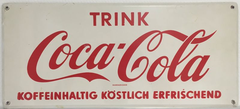 Coca-Cola Warenzeichen Koffeinhaltig Köstlich Erfrischend Blechschild, 50,5 x 22,5 cm, flach mit abgeschägten Kanten sehr schwere Ausführung 1950'er/60'er Jahre, selten Zustand 0-1 Euro 150,- |