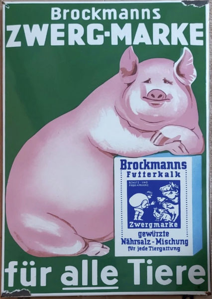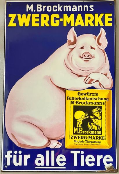 Für alle Tiere Die Brockmanns Sau hier in der 1930'er Jahre Version in Blau! Emailschild, Maße 60 x 40 cm, abgekantet Zustand 1- 1930'er Jahre Hersteller-Bez.: Titan Email, Münchener Emaillier- u. Stanzwerke Euro 1250,- |