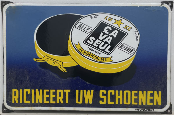 Schoencrem Boot polish Luxe Ricineert uw Schoenen Emailleschild, 49 x 31 cm, abgekantet Zustand 2 datiert 1949 TPB 578/110/49 Euro 190,- |