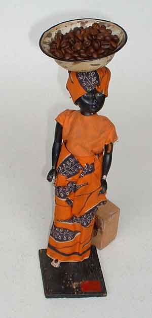 Kaffee - Schönheit uralte Werbefigur aus eine Kaffeerösterei bzw. Kolonialladen, kleine emaillierte Schale mit Original Kaffeebohnen in Vorkriegsqualität, Höhe 35 cm, vermutlich ein Unikat Zustand 2 180 ,- €uro |