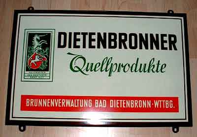 Dietenbronner Quelle schönes und gut erhaltenes Mineralwasser Schild, emailliert, abgekantet, 40 x 50 cm, Bad Dietenbronn Zustand 1 EURO 180,- |