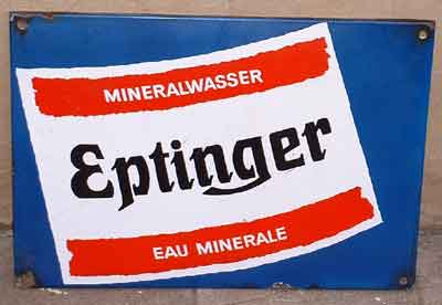 Eptinger Mineralwasser abgekantetes Emailleschild, 38 x 54 cm, zwei Fehlstellen im Schild gut passend übermalt, Entwurf Herbert Leupin Zustand 3 190 €uro |