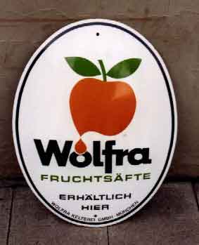 Wölfra Apfelsaft Emailschild, 50 x 64 cm, gewölbt, 50er Jahre, schöner Entwurf zum Thema, eine kleine Stelle im Weiß übermalt, sonst TOP! Zustand 1- €uro 180,- |