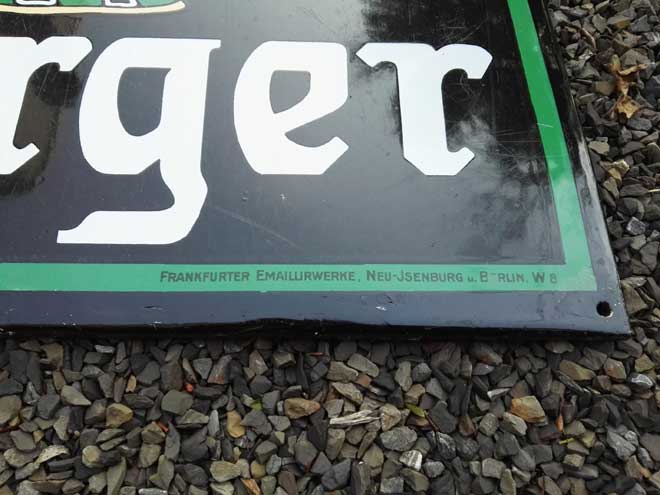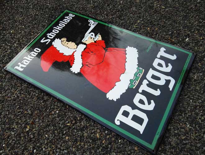 Emailleschild, abgekantet, plakative Größe von 120 x 80 cm, eins der schönsten Emailschilder überhaupt, dick emailliert, tolle FArben, unglaubliiche Wirkung, wird fast nie angeboten der linke RAnd des Schildes wurde professionell restauriert, ein absolutes Highlight! Zustand 1 17500 Euro |