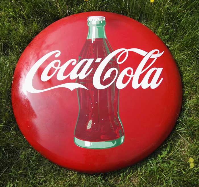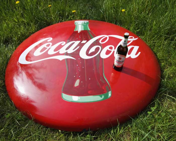 das größte Coke Schild, USA um 1950, das Schild hing mit seiner schieren Größe an Highways, dick emailliert, extrem gewölbt, Durchmesser ca. 120 cm, wird fast nie angeboten, ein Kracher auf jeder weißen Wand Auf dem Sschild steht eine normale 0,5 Liter Bierflasche - keine Miniatur ;-)) Zustand 1 9800 Euro |