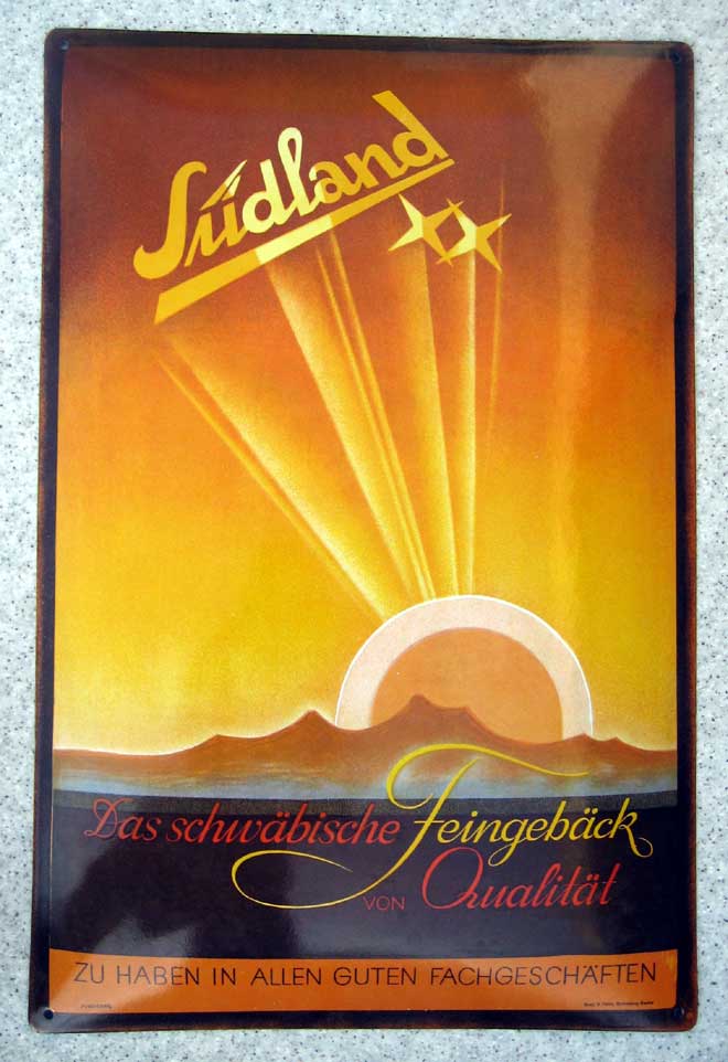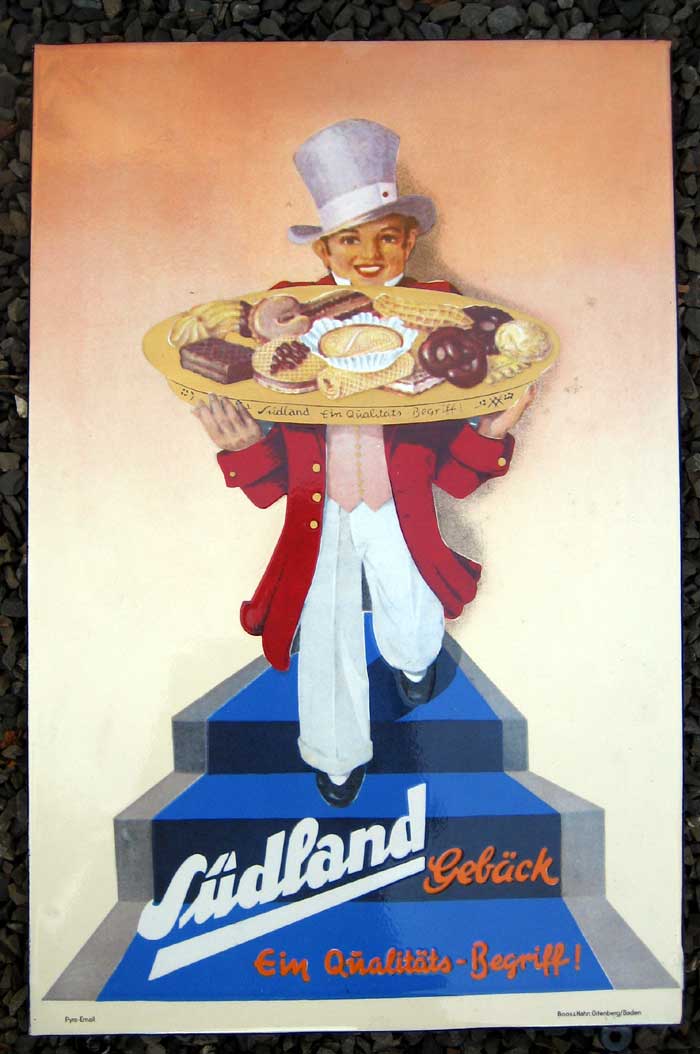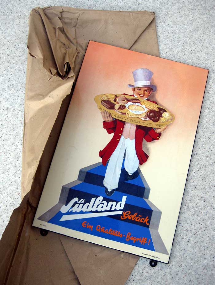 Emailleschild, abgekantet, toller Entwurf aus den 50er Jahren, wird selten angeboten, ca. 50 x 75 cm, Eckschäden wurden passend beigemalt, sehr dekoratiov Zustand 3 1500 Euro |
