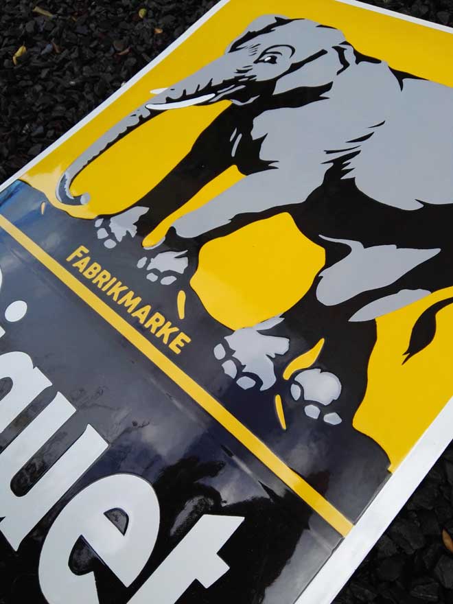 gewölbtes Emailschild, dick emailliert, schabloniert, 33 x 50 cm, neuzeitliches Händlerexemplar, im Handel nicht zu bekomme, nach historischen Vorbildern in aufwändigem Handschablonierverfahren hergestellt Zustand 0 190 Euro |