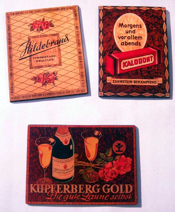 Holzschilder, die früher als Innenraumwerbung dienten, z.T als Intarsienarbeit, sehr dekorativ, ein interessantes Sammelthema, Maße ca. 20 x 30 cm Zustand 2 Stück 140 Euro |