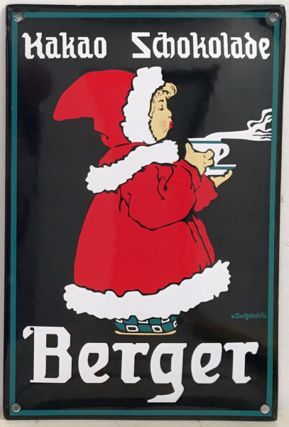 Kakao - Schokolade Wandsbek / Hamburg Emailleschild, 63 x 35 cm, flach mit gewölbtem Rand Zustand 3-4 1920'er Jahre Euro 90,- |