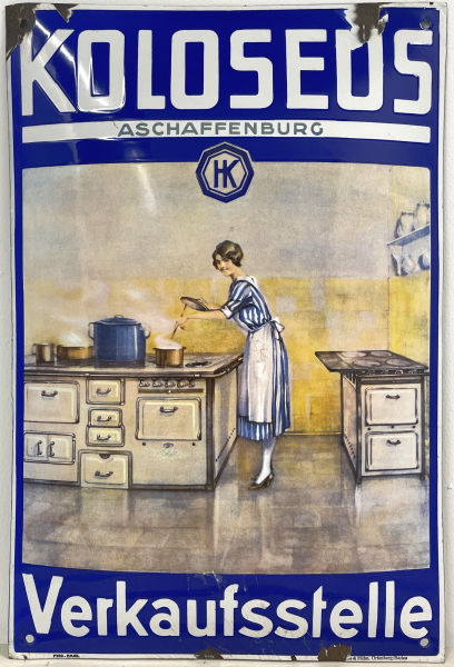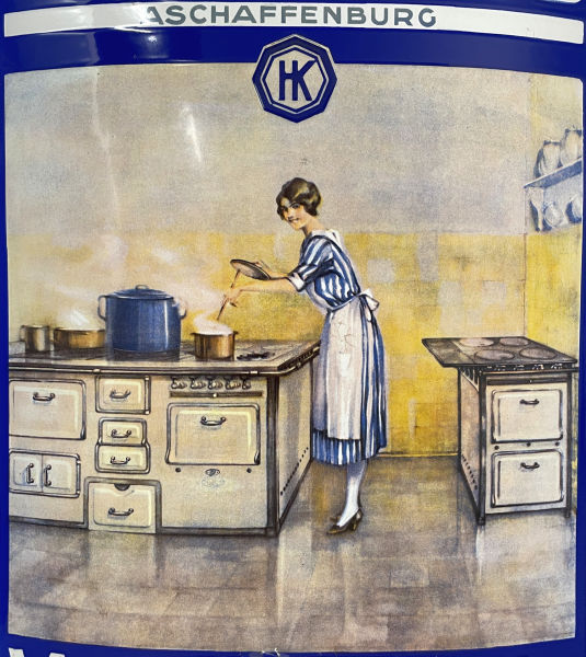 Verkaufsstelle Aschaffenburg Emailschild, Maße 49,5 x 33 cm, gewölbt Zustand 2+ 1920'er Jahre Hersteller: Pyro Email, Boos & Hahn, Ortenberg / Baden Euro 2700,- siehe Detailansicht von Herd und Köchin |