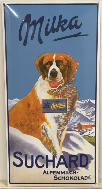 Suchard Alpenmilch Schokolade Emailleschild, 67,5 x 36 cm, gewölbt Zustand 0-1 1980'er Jahre Der Milka Bernhardiner in der ganz großen Version mittlerweile selten und gesucht hergestellt im Emaillierwerk Hannover Mellendorf Euro 360,- |