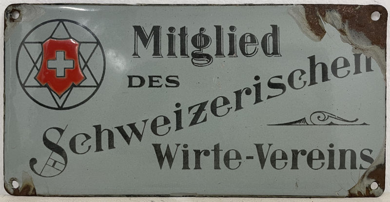 Schweizerischen Wirte-Vereins Emailleschild, 20 x 10cm, gewölbt Das Rot der schweizer Flagge ist zuckergussartig emailiert. Zustand 2- um 1910, sehr selten Euro 340,- |