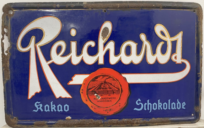 Kakao - Schokolade Reichardtwerke Wandsbek bei Hamburg Emailschild, 59,5 x 35,5 cm, flach mit gewölbtem Rand 20'er Jahre Zustand 1, sehr selten mit komplett erhaltenem Gold im Schriftzug! Hersteller-Bez.: Emaillierwerk Peters, Elberfeld Euro 480,- siehe Detailansicht des Reichardt-Siegels |