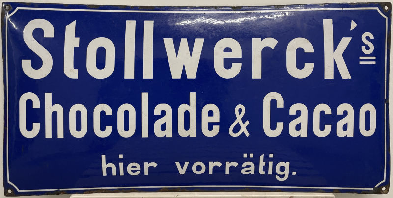 Cacao & Chocolade hier vorrätig. Emailschild, 100 x 50 cm, gewölbt Zustand 1-2 sehr schwere Trägerplatte, dick emailliert um 1900/1910 Euro 1280,- |