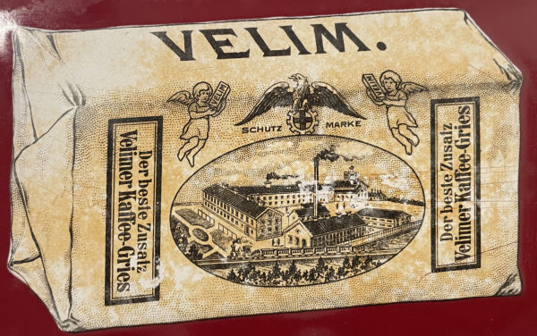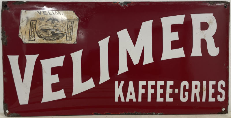 Kaffee-Gries Velim Emailschild, Maße 50 x 25 cm, gewölbt Zustand 1 selten Österreich, vor 1918 aus Velim, heute in Tschechien gelegen Euro 560,- siehe Detailansicht der Kaffee-Packung |