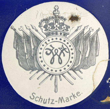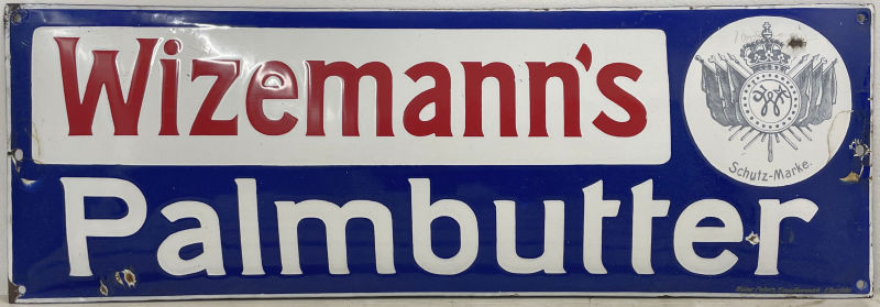 Palmbutter Emailschild, Maße 54,7 x 18,5 cm, gewölbt Zustand 2- um 1920 Hersteller-Bez.: Heinr. Peters, Emaillierwerk. Elberfeld. Euro 190,- siehe Detailansicht des Wizemann Signets |