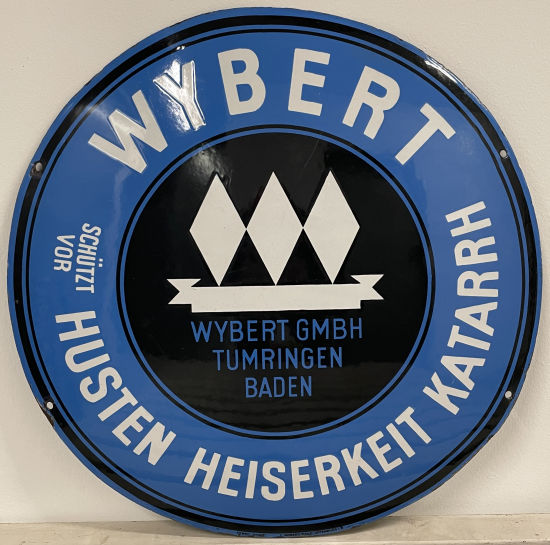 schützt vor Husten - Heiserkeit - Katarrh Wybert GMBH Turmingen Baden Emailschild, 48,5 x 48,5 cm, gewölbt 1930'er Jahre Zustand 1+ Hersteller: Ferro Email, C. Robert Dold, Offenburg i.B. Euro 560,- |