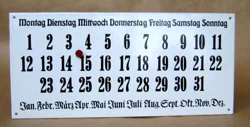 Kalender aus Emaille kleines Emailschild, flach als Kalender, mit Magnet, ca 18 x 40 cm, Alter unbekannt Zustand 2 50 Euro |