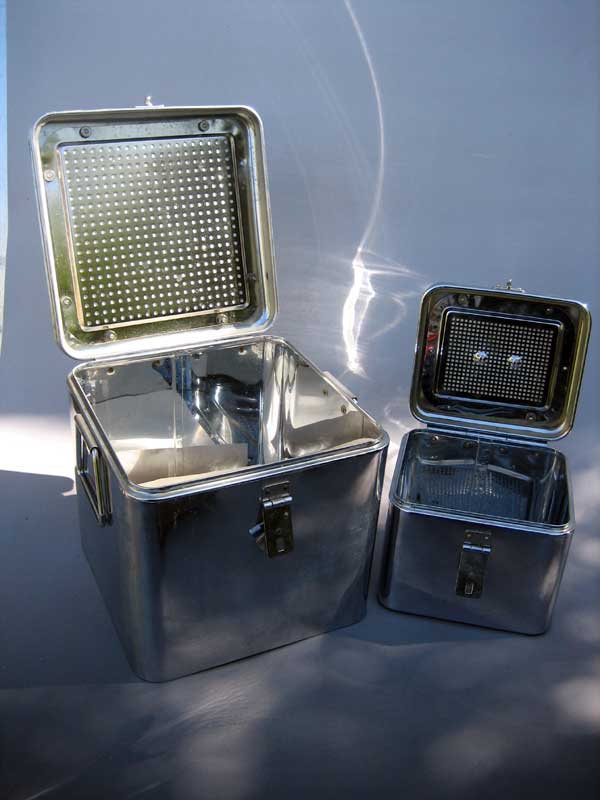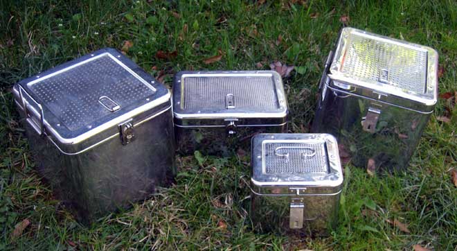 vercromte Behälter zur Desinfektion aus dem Krankenhaus, 4 Stück, guter Zustand, wertiger Verschuß, selten, alle zusammen, sehr dekorativ
