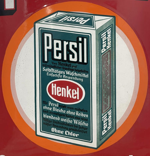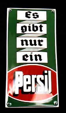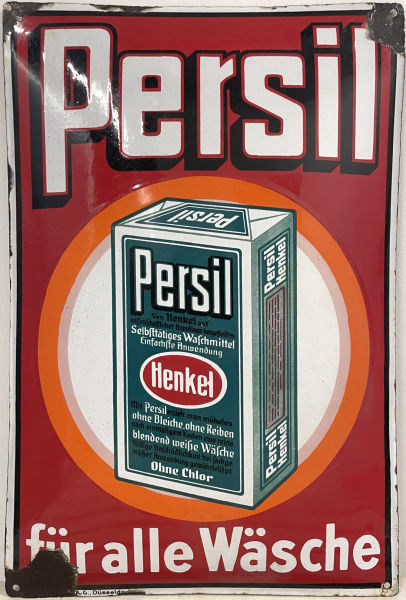 man wäscht doch mit Persil Emailschild, Maße 59 x 39 cm, gewölbt 30'er Jahre restauriert, vorher Zustand 4 Hersteller-Bez.: Henkel & Cie. A.G. Düsseldorf Euro 280,- |