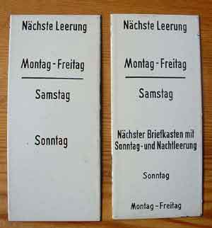 Briefkastenschilder flache Emailschilder aus den bekannten gelben Kisten, mit den gewohnt kundenfreundlichen Zeiten Zustand 1 Stück EURO 40,-  |