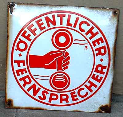 Öffentlicher Fernsprecher gewölbtes Emailschild in ungeputztem Fundzustand, strahlt sehr viel Patina aus, kann abert natürlich auch wieder auf Hochglanz poliert werden,, schöner grafischer Entwurf, signiert SB, 35 x 35 cm Zustand 2- 150 €uro  |
