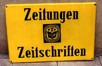 Postvertrieb Zeitung - Zeitschriften abgekantetes Emailleschild, 60 x 40 cm, guter Zustand, Deutsche Post Zeitungsvertrieb, wohl 50er Jahre  |