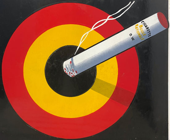Cigarettes Odon Warland Emailschild, Maße 65 x 55 cm, abgekantet Zustand 2-3, Randschäden retouchiert, Motiv unbeschädigt datiert 1935 Hersteller-Bez.: BN. 121 Odon Warland (CEBETAMA) ad del 40, Rue de Koninck, Bruxelles Steuer-Bez.: T.P. Bruxelles 372-310-1935 Euro 440,- siehe Detailansicht der Zigarette in der belgischen Zielscheibe |