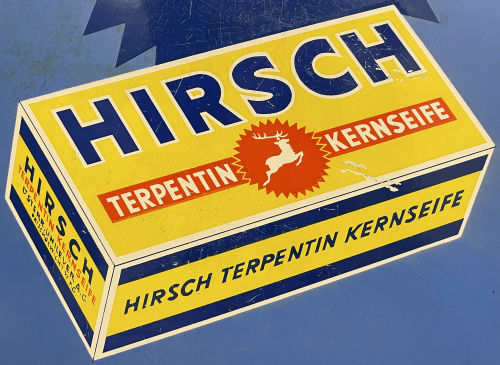 Terpentin Kernseife Die gute echte! Extra waschkräftig! Österreichische Unilever A.G. Emailschild, Maße 44 x 31 cm, abgekantet Zustand 3 1950'er Jahre Hersteller-Bez.: Austria Email Euro 190,- siehe Detailansicht der Seifen-Packung |